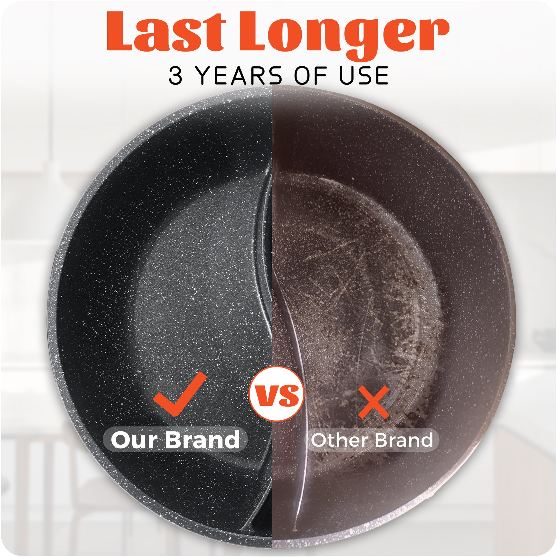 1、4L Dual-Flavor Design: Equipped with a practical divider, allowing you to cook two different broths simultaneously, offering a variety of flavors for family and friends to enjoy diverse taste experiences.
